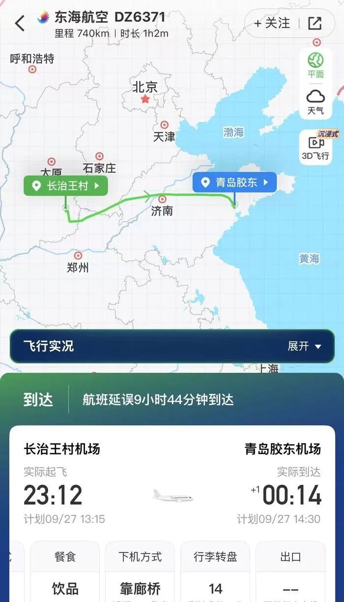 另据航旅纵横信息,9月27日从昆明飞往青岛的DZ6371航班,10:05从昆明长水机场起飞,12:20到达长治王村机场,执飞飞机编号为B1770,后续航程27日23:12从长治王村机场起飞,28日00:14到达青岛胶东机场,执飞飞机编号为B1105。全航程耗时14小时9分钟,航程延误9小时44分钟。