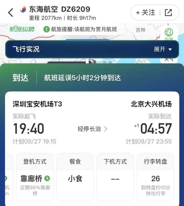 界面新闻记者查询航旅纵横航班信息,东海航空9月27日DZ6209航班19:15从深圳宝安机场起飞,经2小时7分抵达长治,执飞飞机编号B1105,原计划22:40从长治起飞,用时52分钟于23:55抵达北京大兴机场,实际航班信息显示延误5小时2分抵达,实际是28日4:05从长治起飞,4:57抵达北京大兴机场,执飞飞机编号B1770。